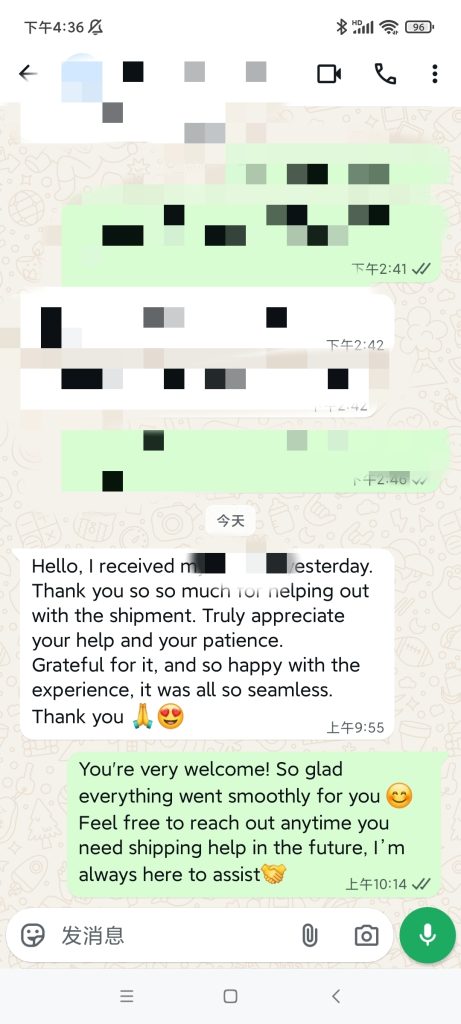 从提货到送达,全程仅用17天!Ryan先生收到设备后非常开心,还特意发消息感谢了我,说整个运输过程非常顺畅,特别感激我的帮助和耐心。